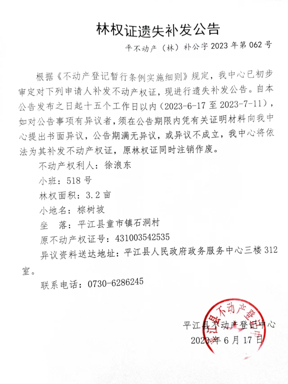 徐浪东林权证遗失补发公告