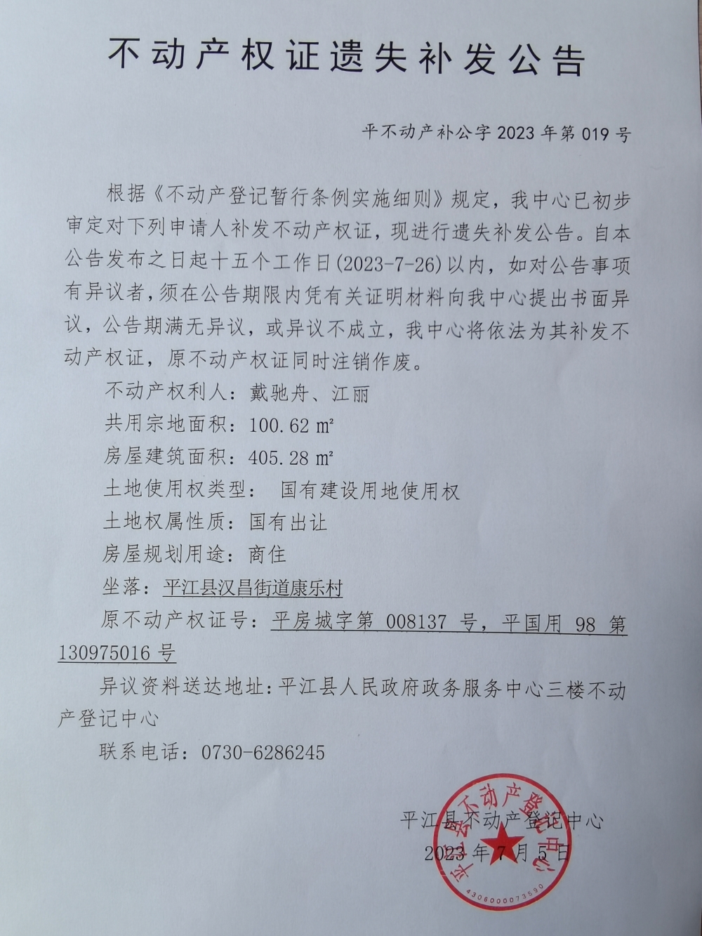 戴驰舟、江丽不动产权证遗失补发公告