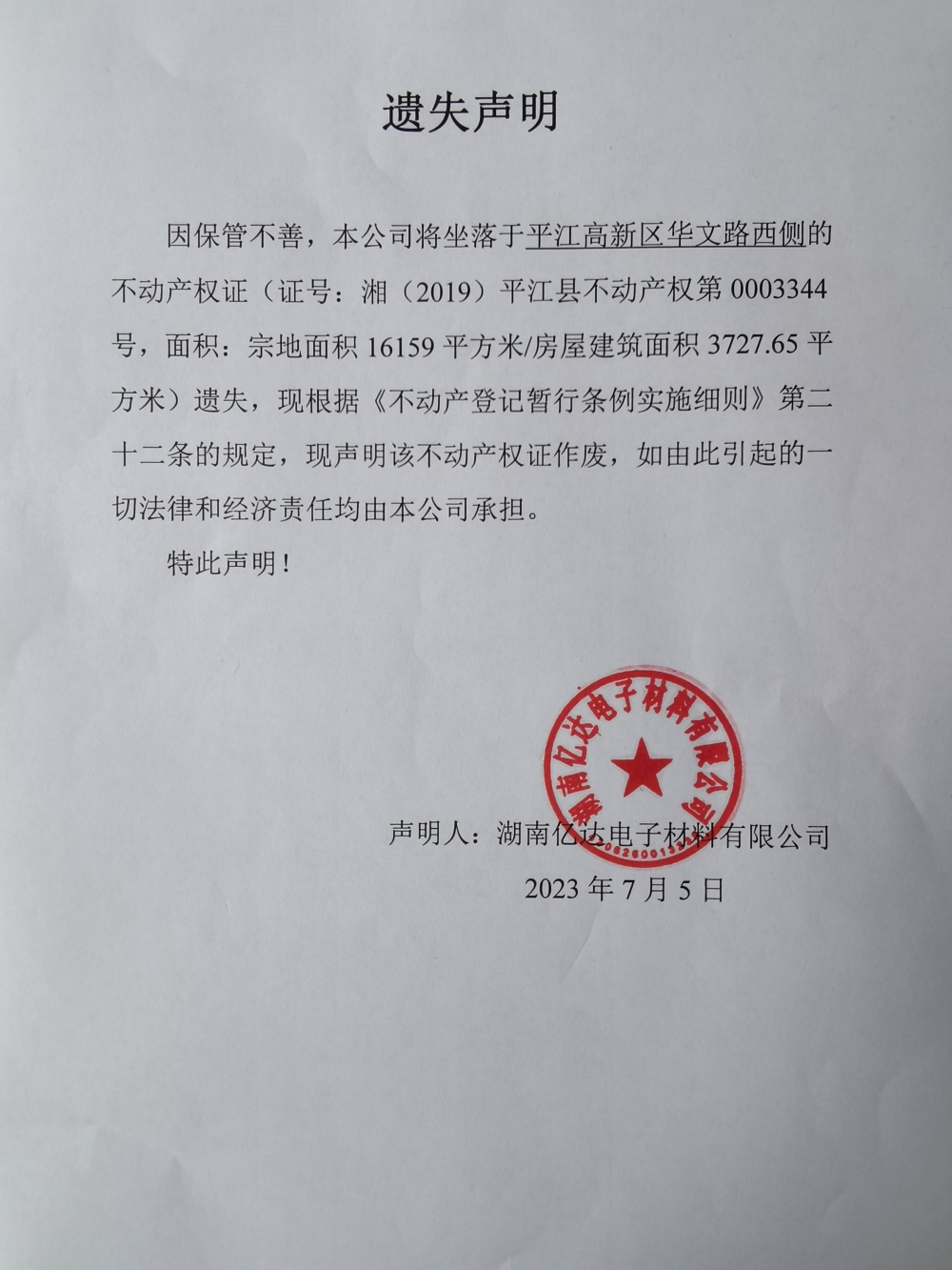 湖南亿达电子材料有限公司不动产登记权证遗失声明
