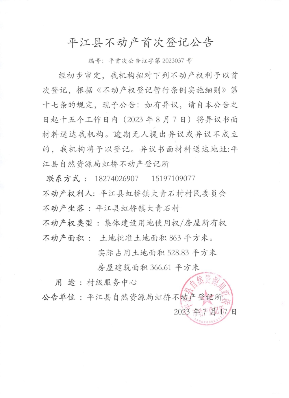 平江县虹桥镇大青石村村民委员会村级服务平台首次登记公告
