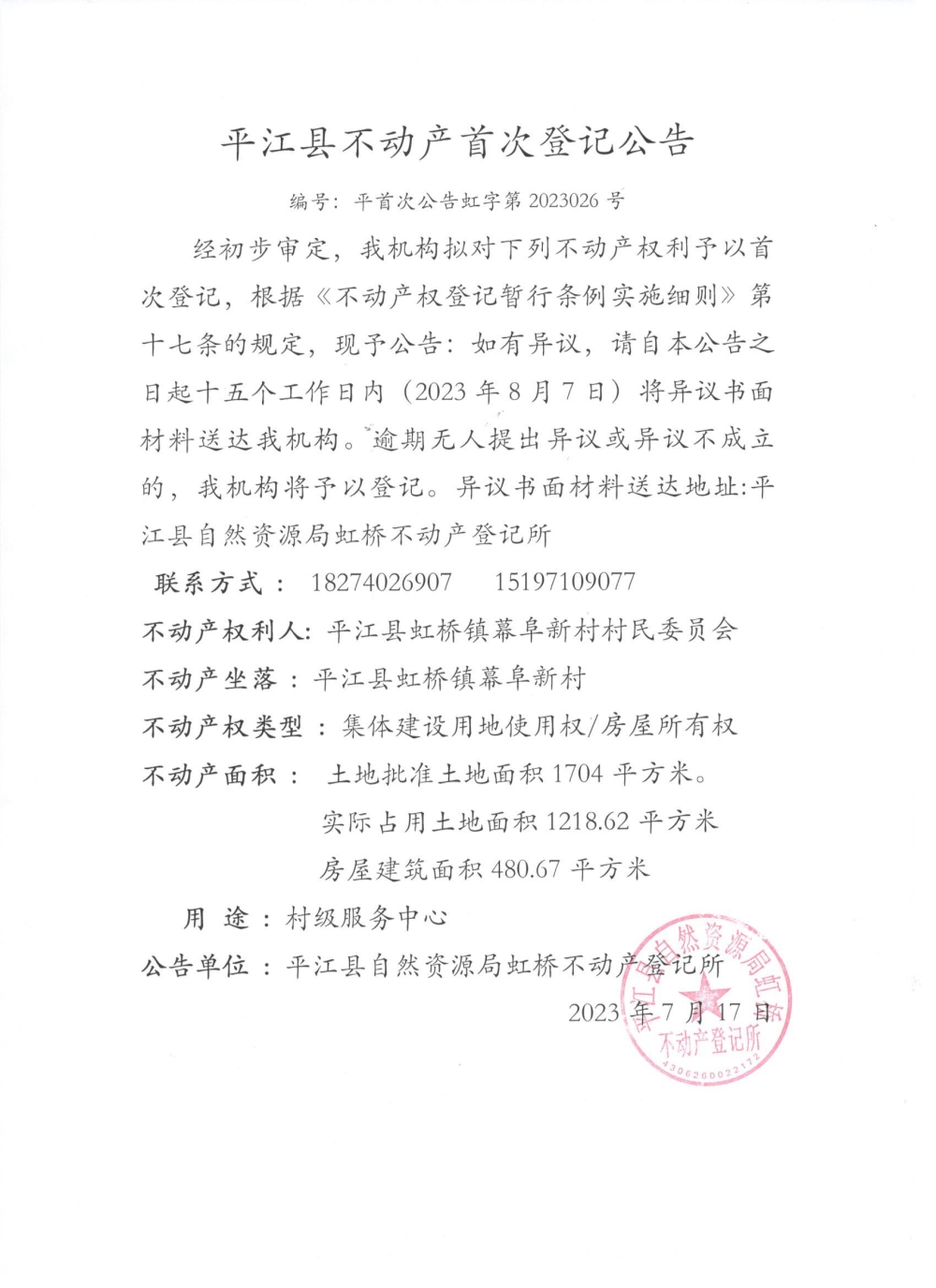 平江县虹桥镇幕阜新村村民委员会村级服务平台首次登记公告
