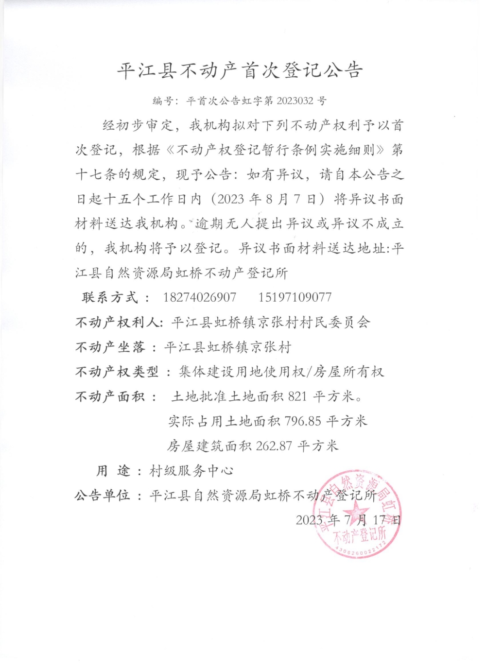 平江县虹桥镇京张村村民委员会村级服务平台首次登记公告