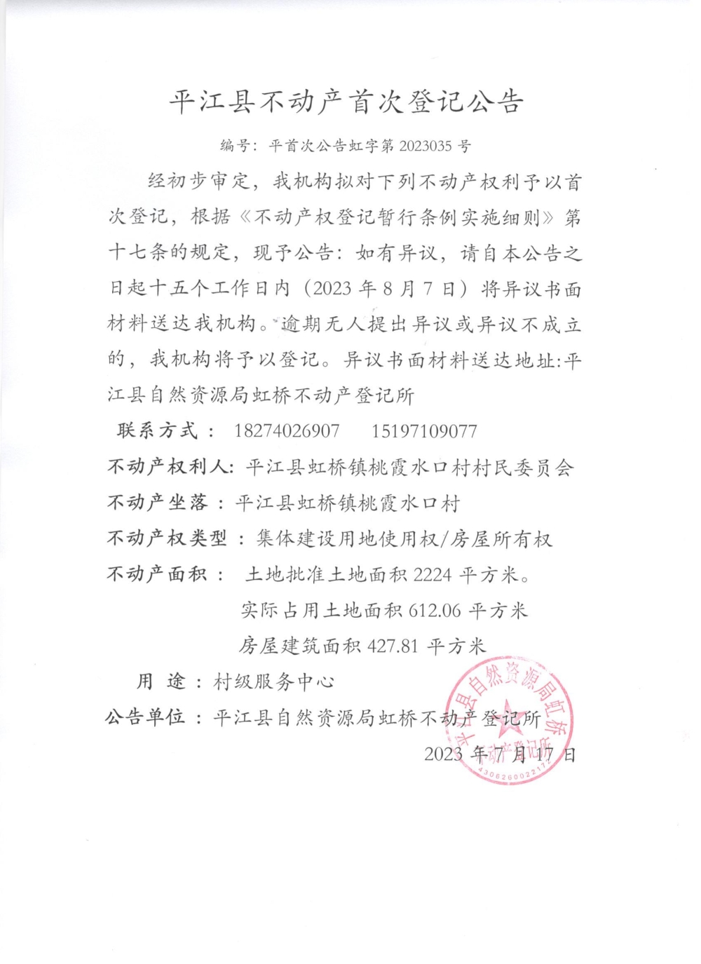 平江县虹桥镇桃霞水口村村民委员会村级服务平台首次登记公告