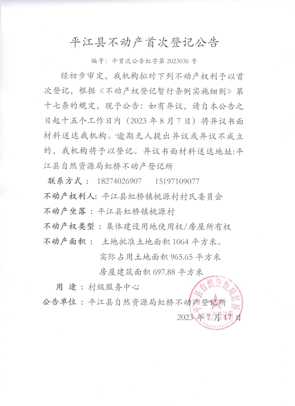 平江县虹桥镇桃源村村民委员会村级服务平台首次登记公告