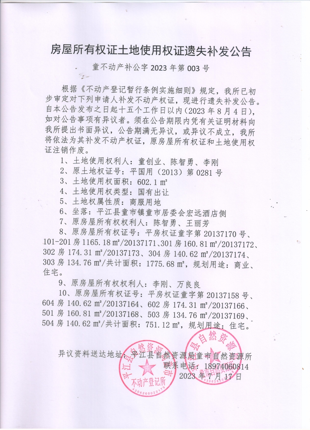 童创业 陈智勇 李刚房屋土地证遗失补证公告