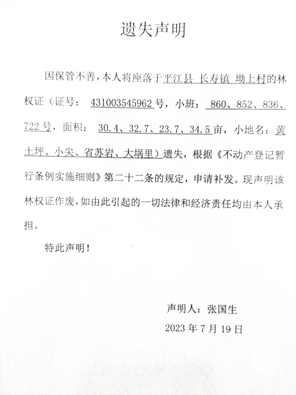 张国生林权证遗失声明