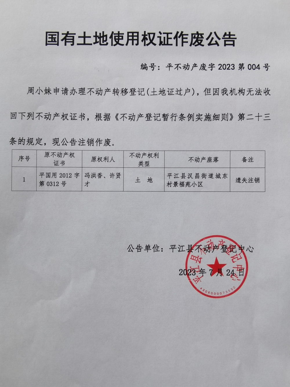 冯洪香、许贤才国有土地使用证注销作废公告