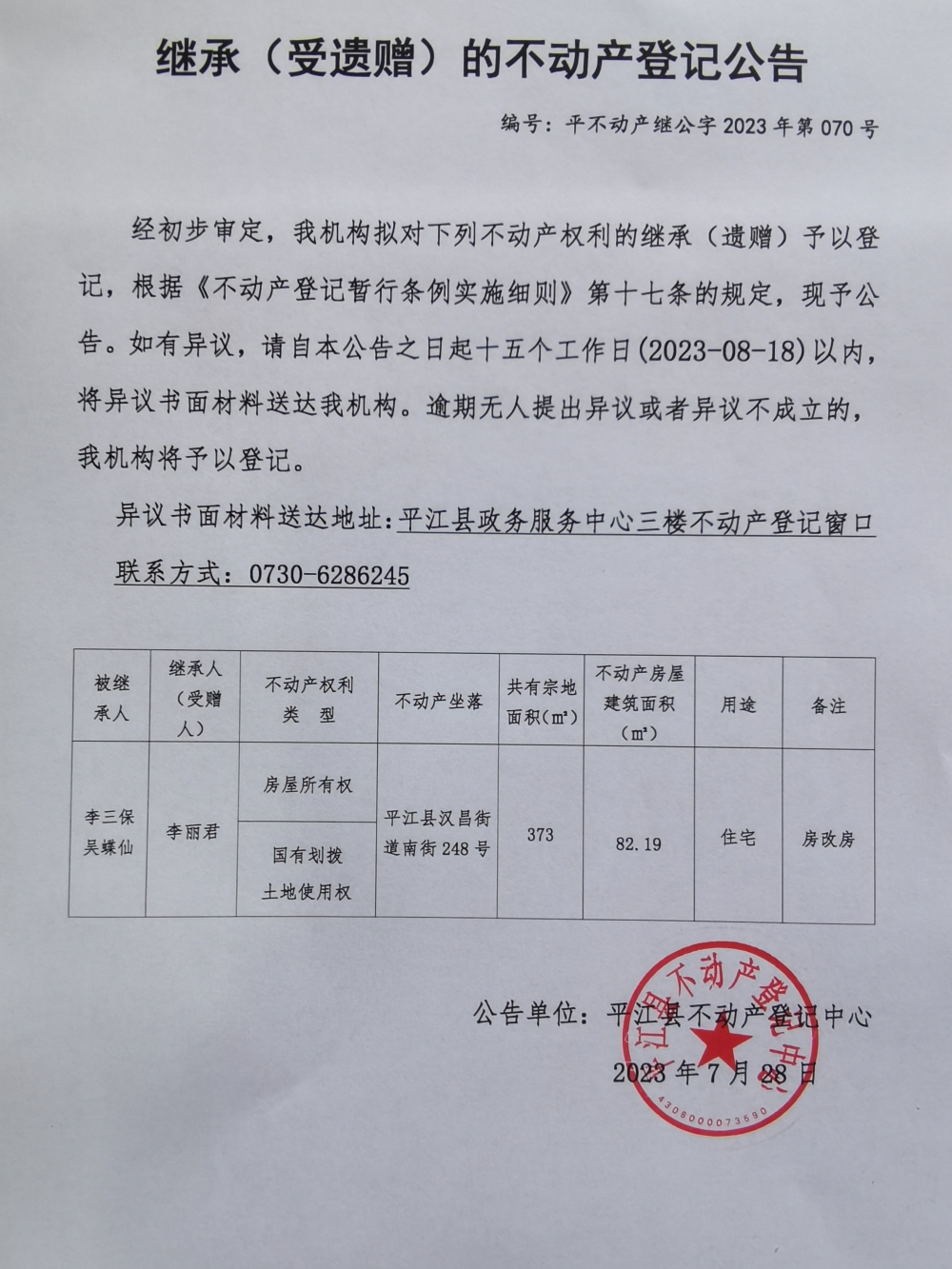 李丽君继承不动产登记公告