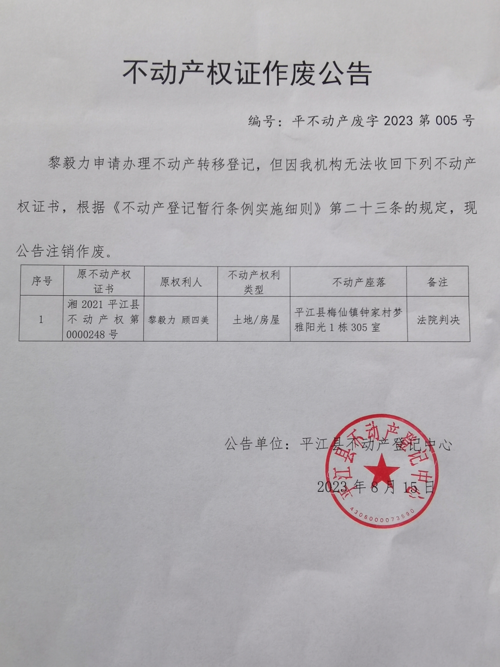 黎毅力、顾四美不动产权证作废公告