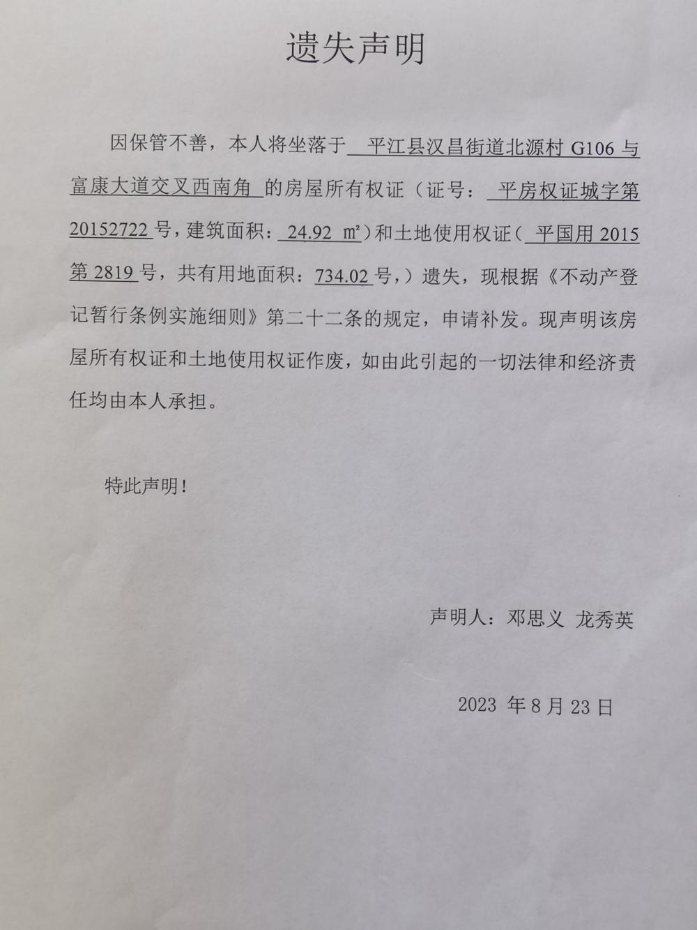 邓思义 龙秀英房产证和土地使用权证遗失声明