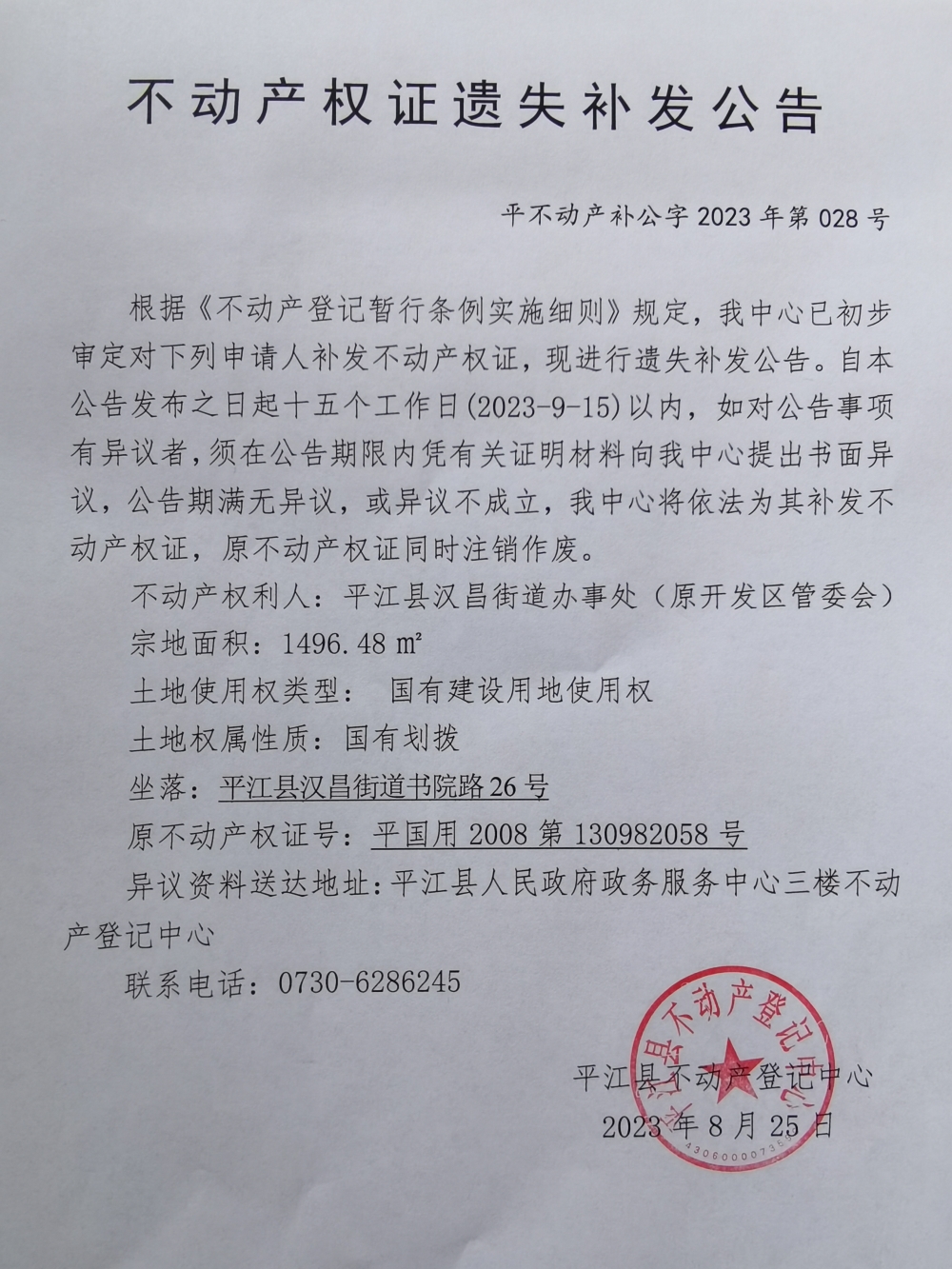 平江县汉昌街道办事处国有土地使用权证遗失补发公告