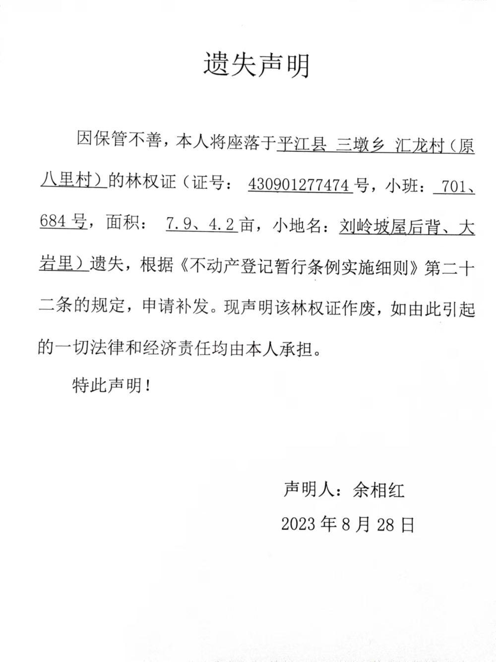 余相红林权证遗失声明