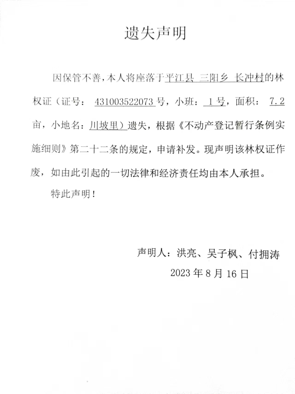 洪亮、吴子枫、付拥涛三户林权证遗失声明