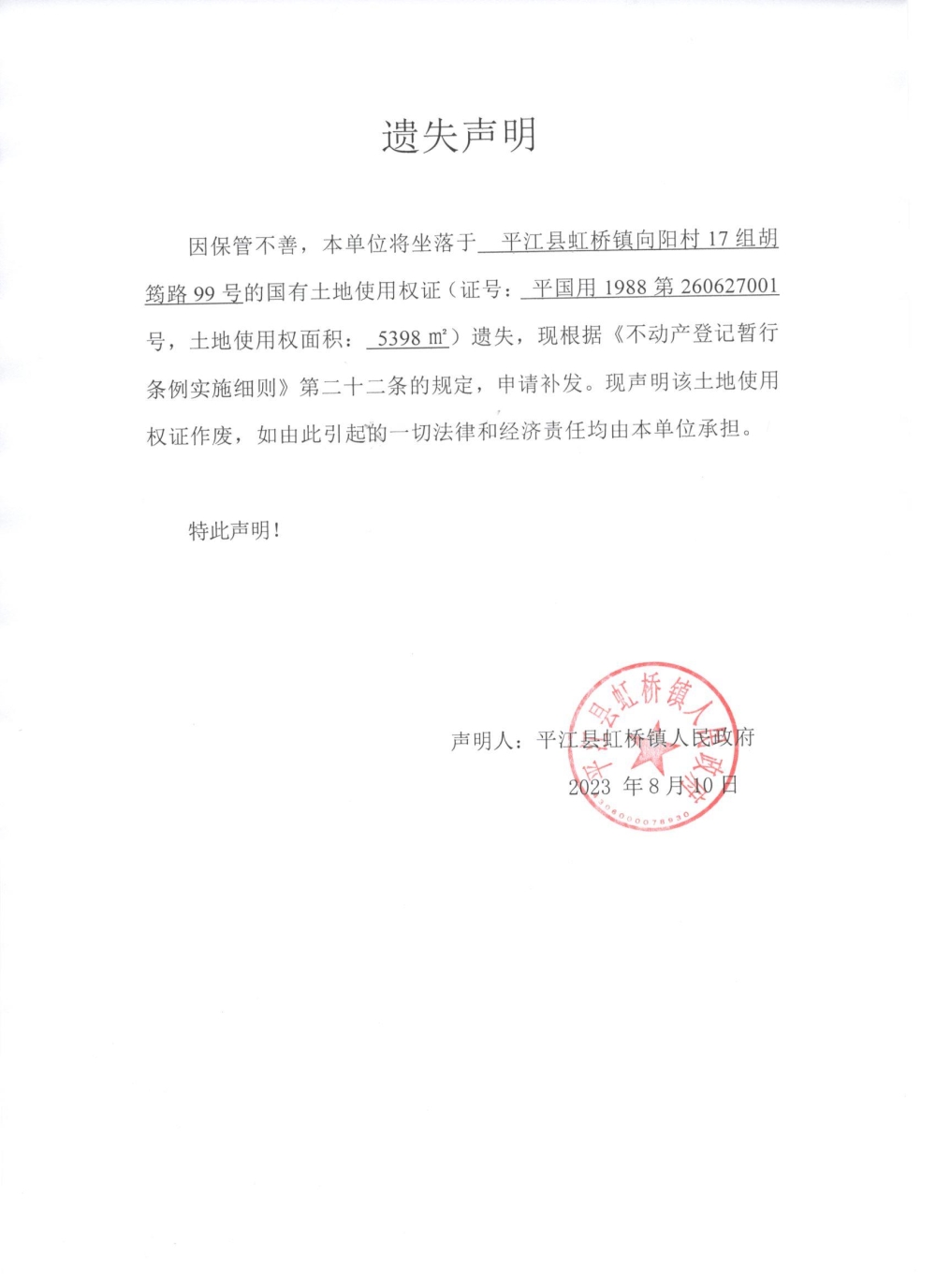 平江县虹桥镇人民政府遗失声明