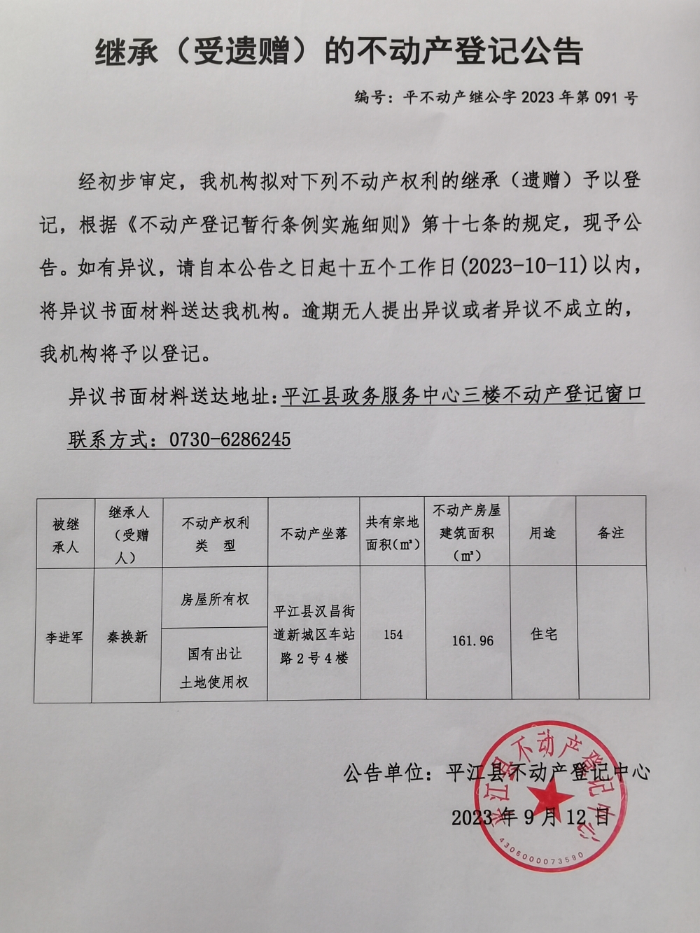 秦换新继承不动产登记公告