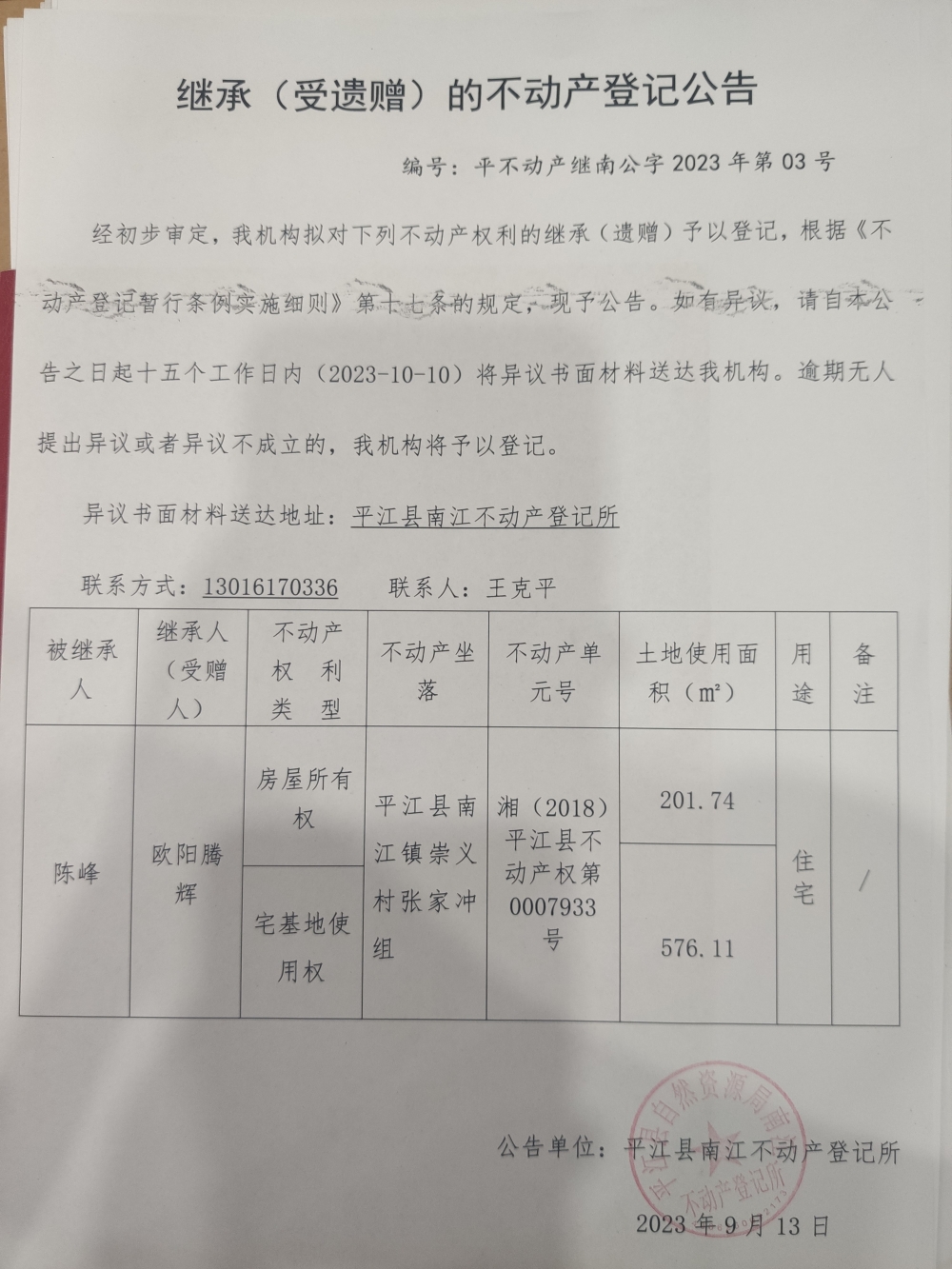 陈峰继承(受遗赠)的不动产登记公告