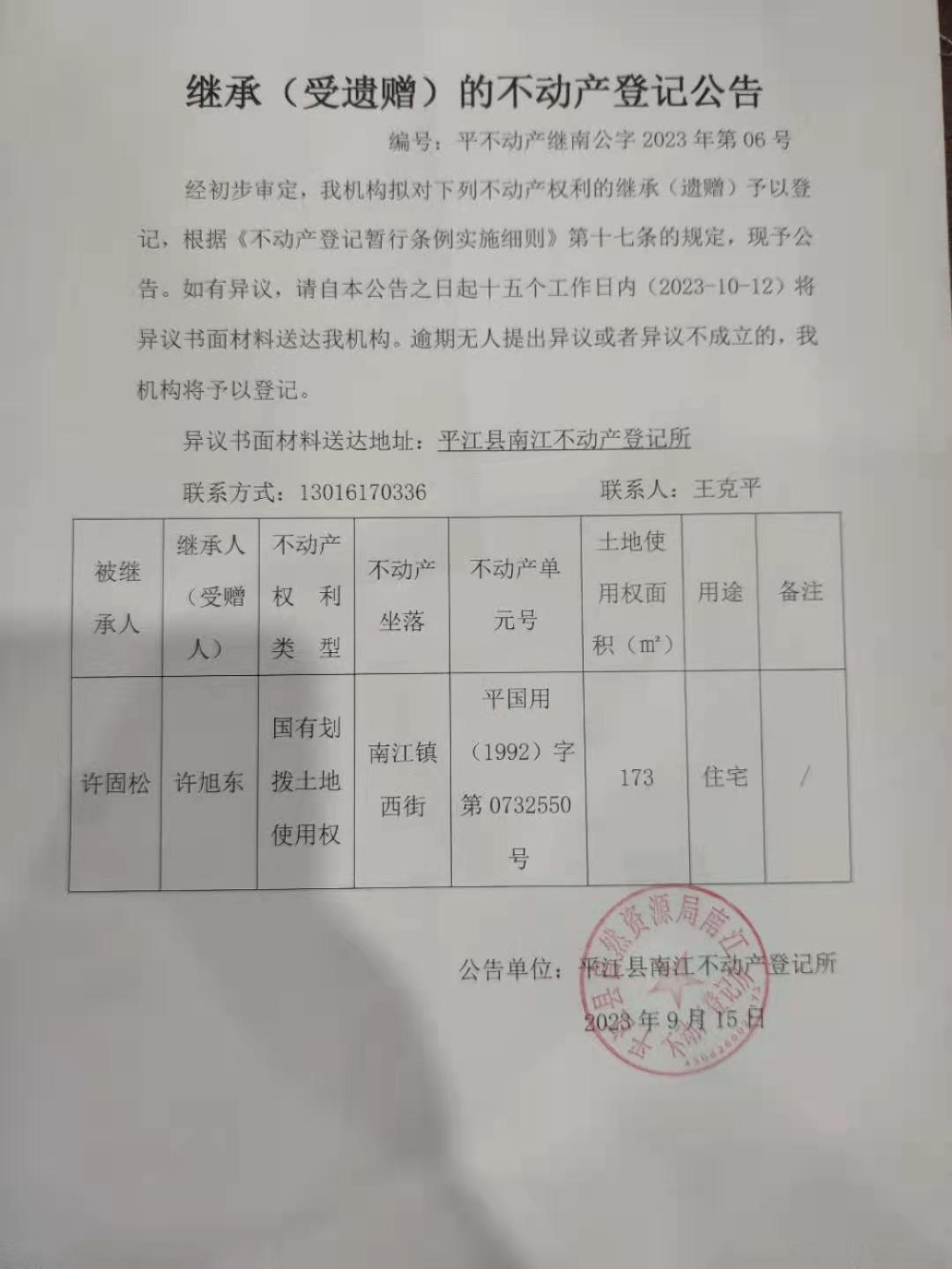 许固松继承(受遗赠)的不动产登记公告