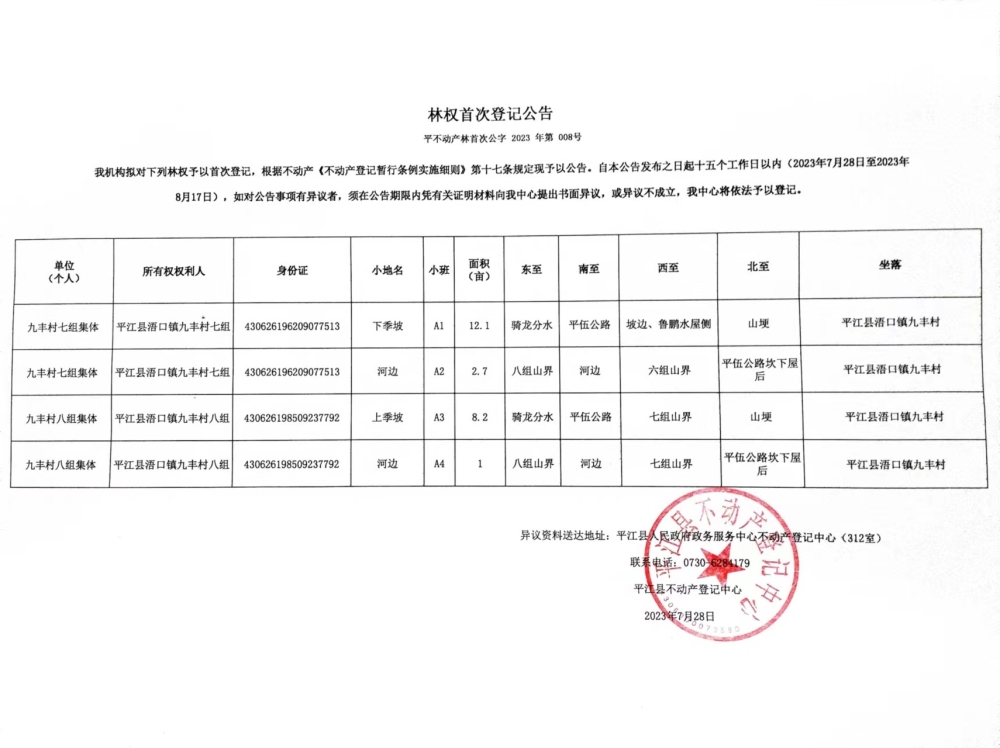 九丰村七组、八组集体林权首次登记公告