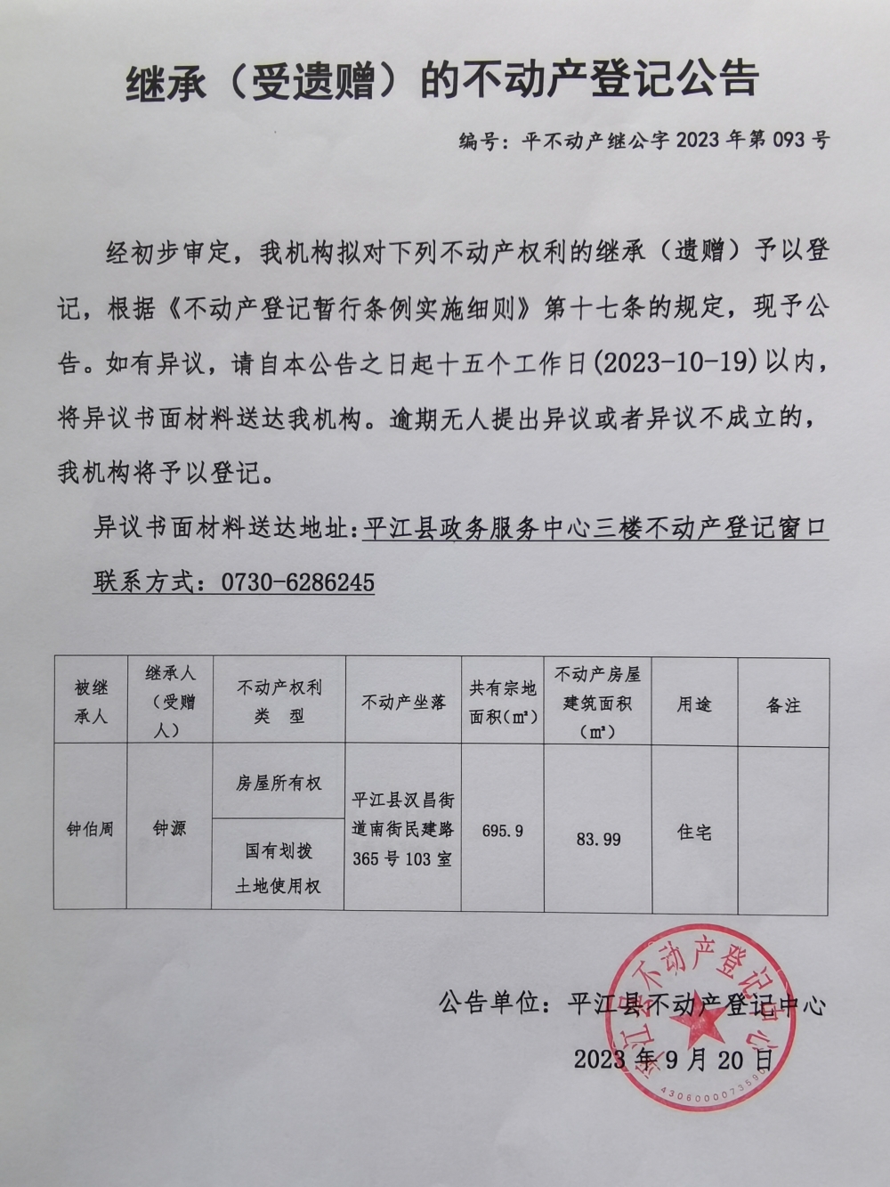 钟源继承不动产登记公告