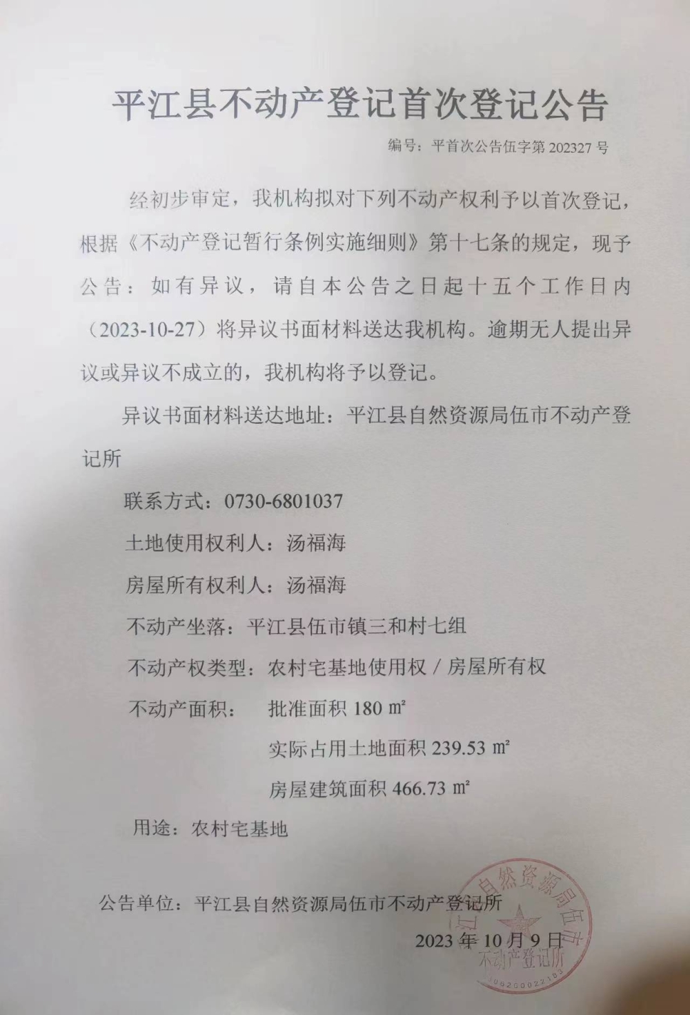 汤福海 不动产登记首次登记公告