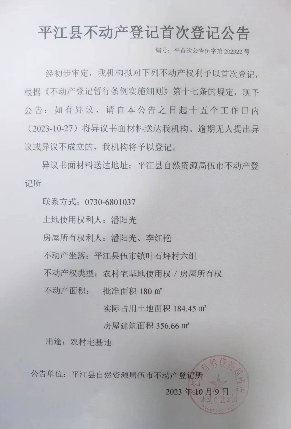 潘阳光 李红艳 不动产登记首次登记公告