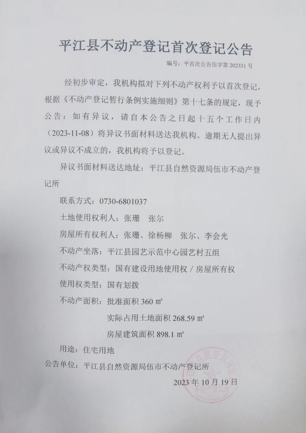 张珊、徐杨柳 张尔、李会光 不动产登记首次登记公告