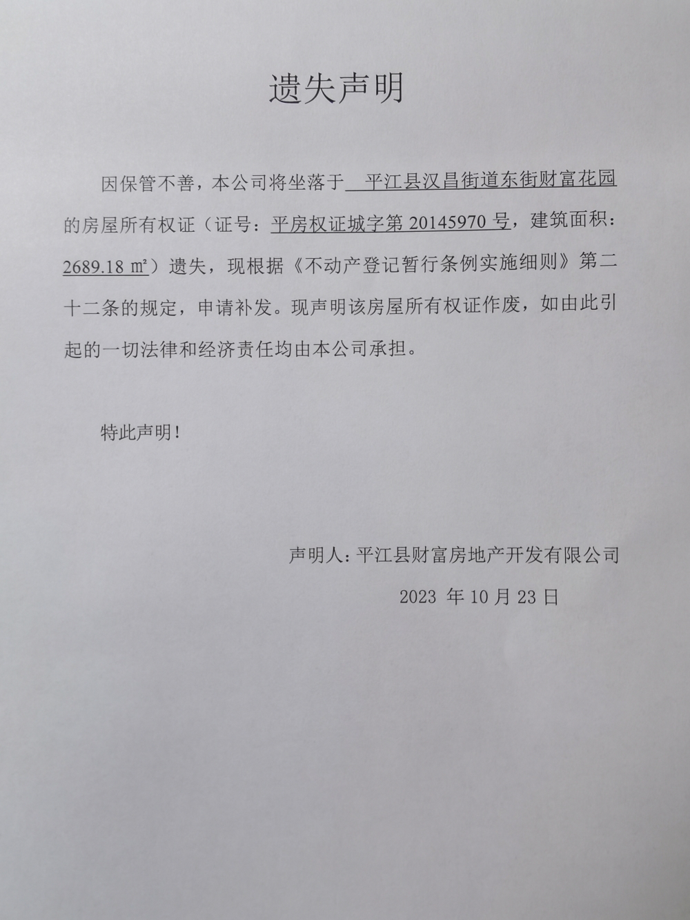 平江县财富房地产开发有限公司不动产权证遗失声明2023034