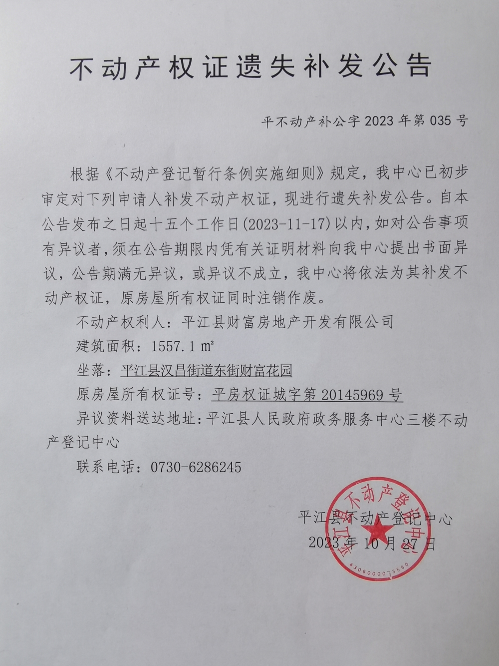 平江县财富房地产开发有限公司不动产权证遗失补发公告2023035