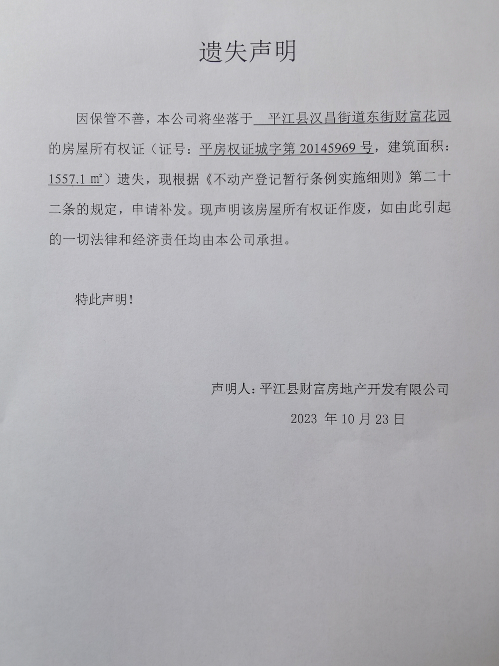 平江县财富房地产开发有限公司不动产权证遗失声明2023035