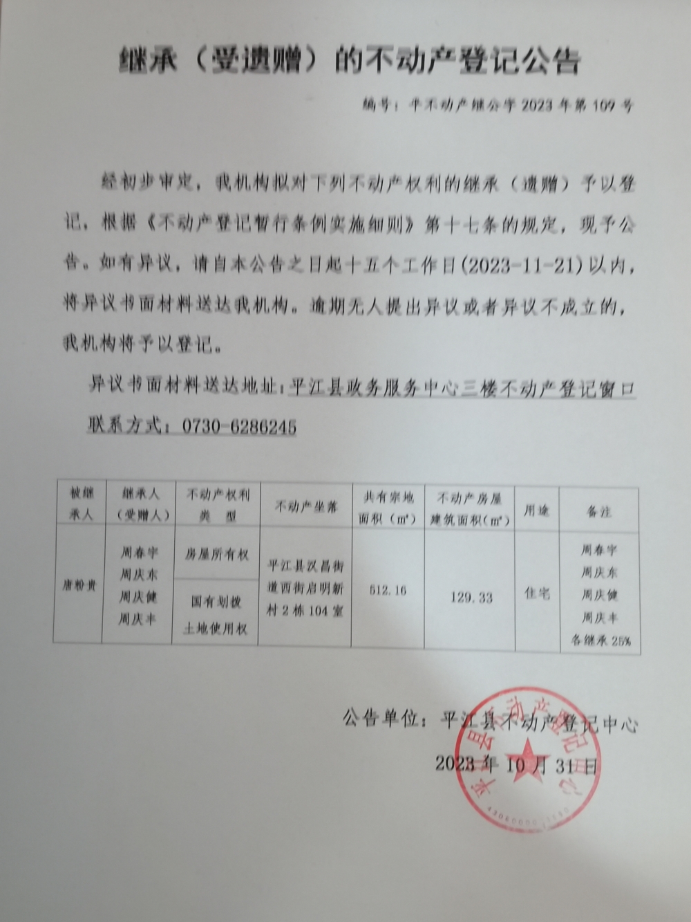 周春宇 周庆东 周庆健 周庆丰继承不动产登记公告