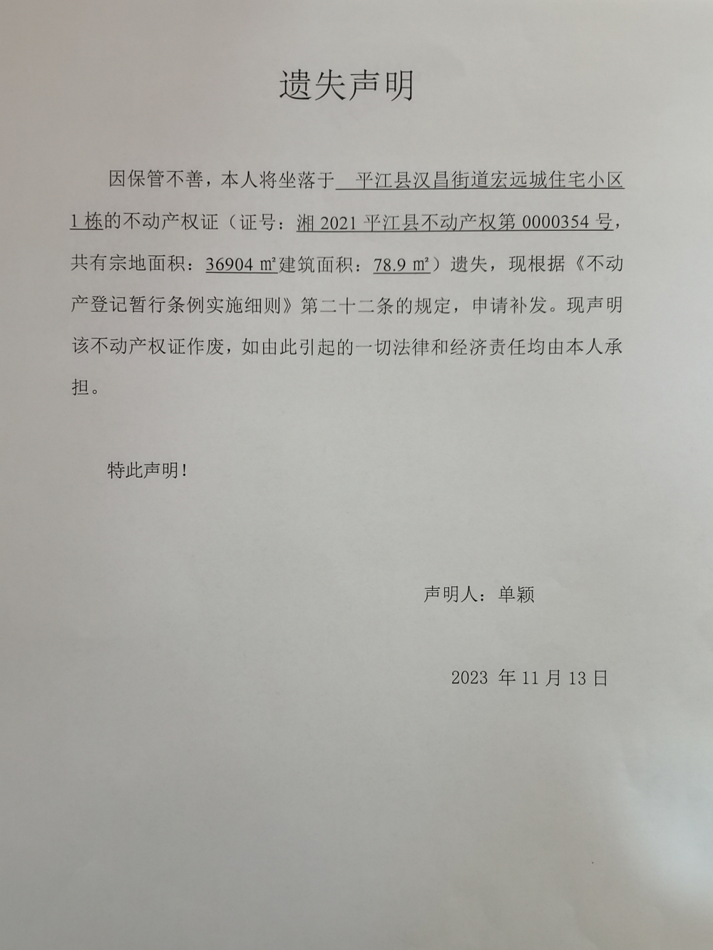 单颖不动产权遗失声明