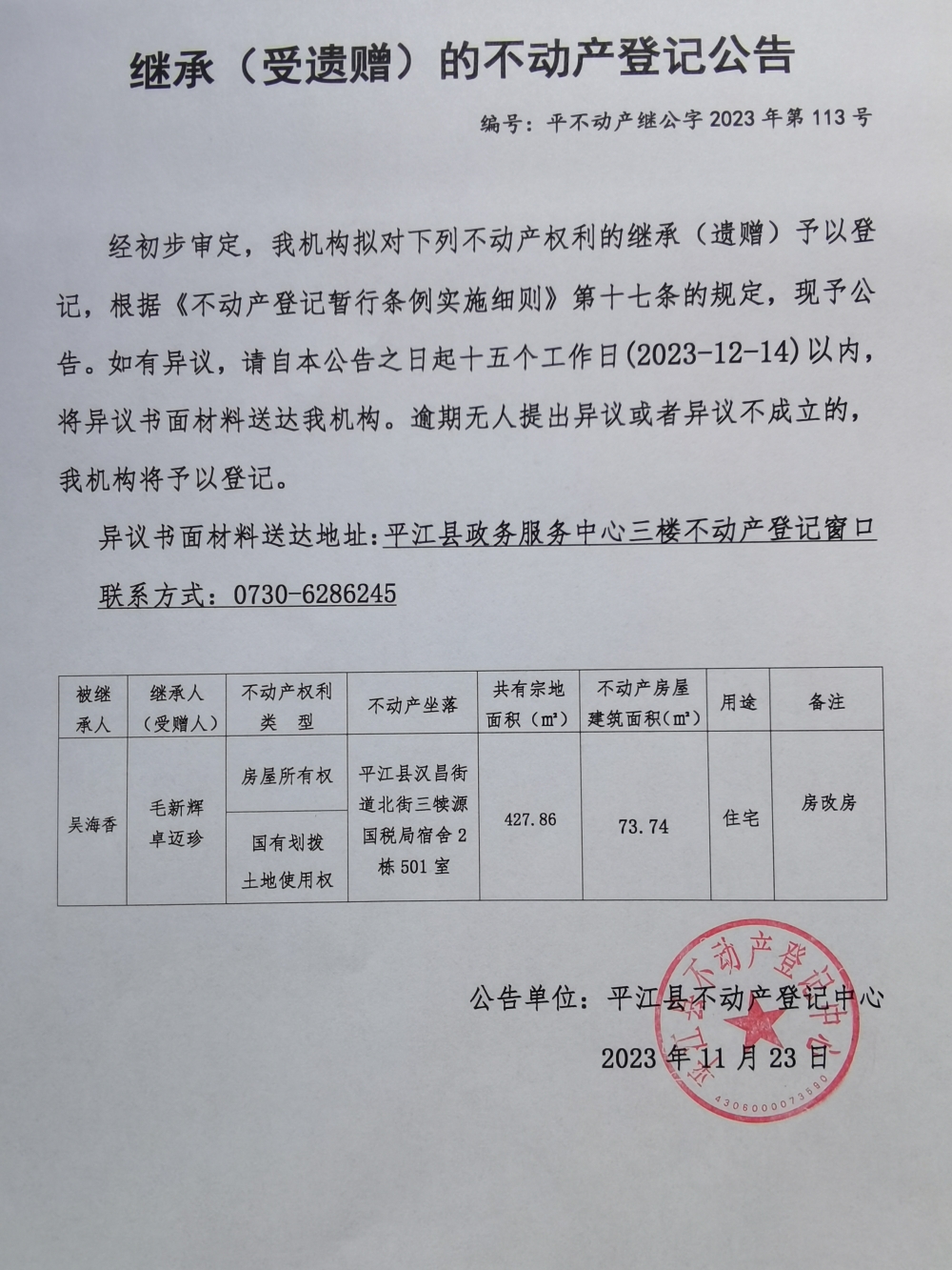 毛新辉 卓迈珍继承不动产登记公告