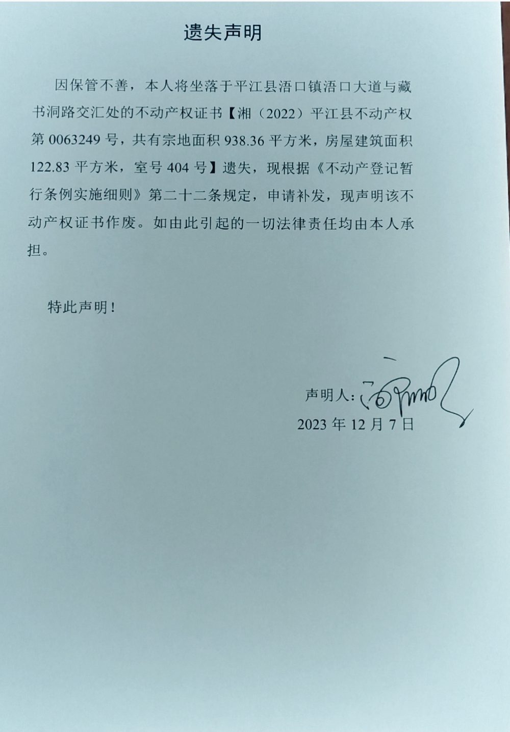 向启明 不动产权证遗失声明
