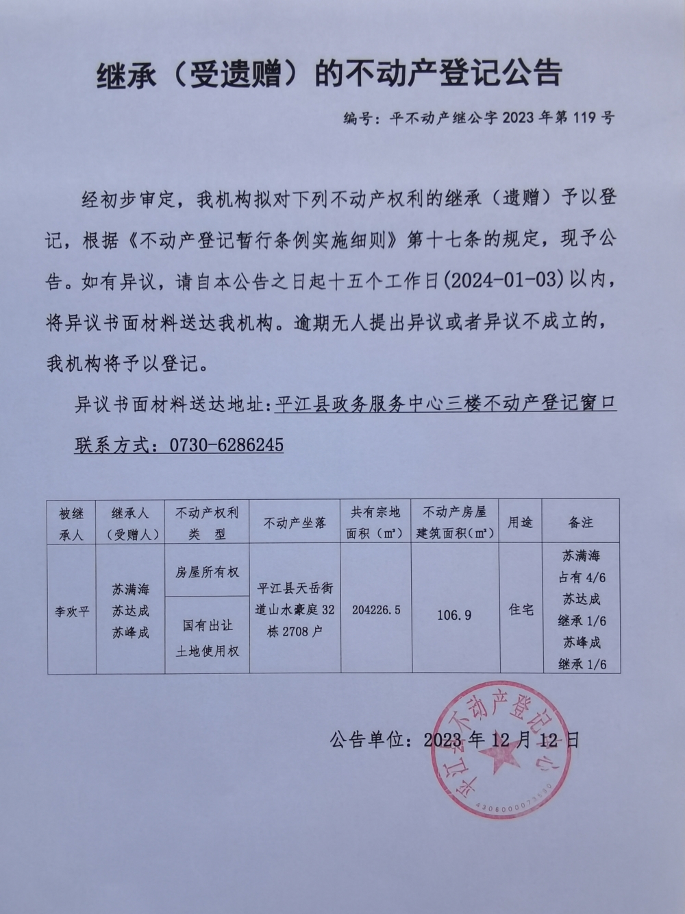 苏满海 苏达成 苏峰成继承不动产登记公告