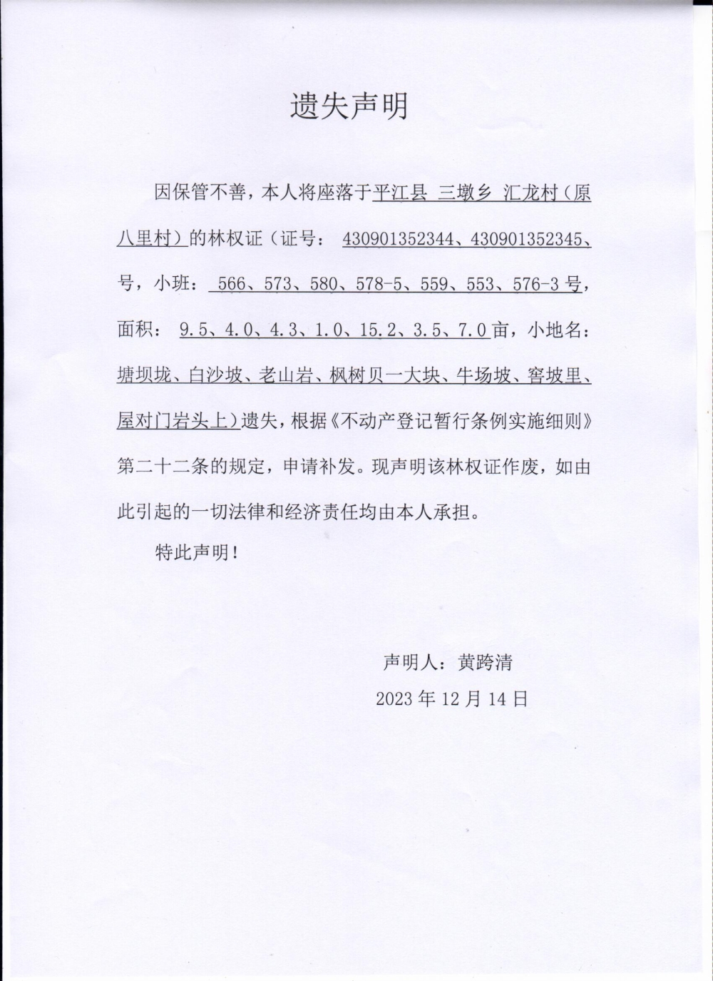 黄跨清林权证遗失声明