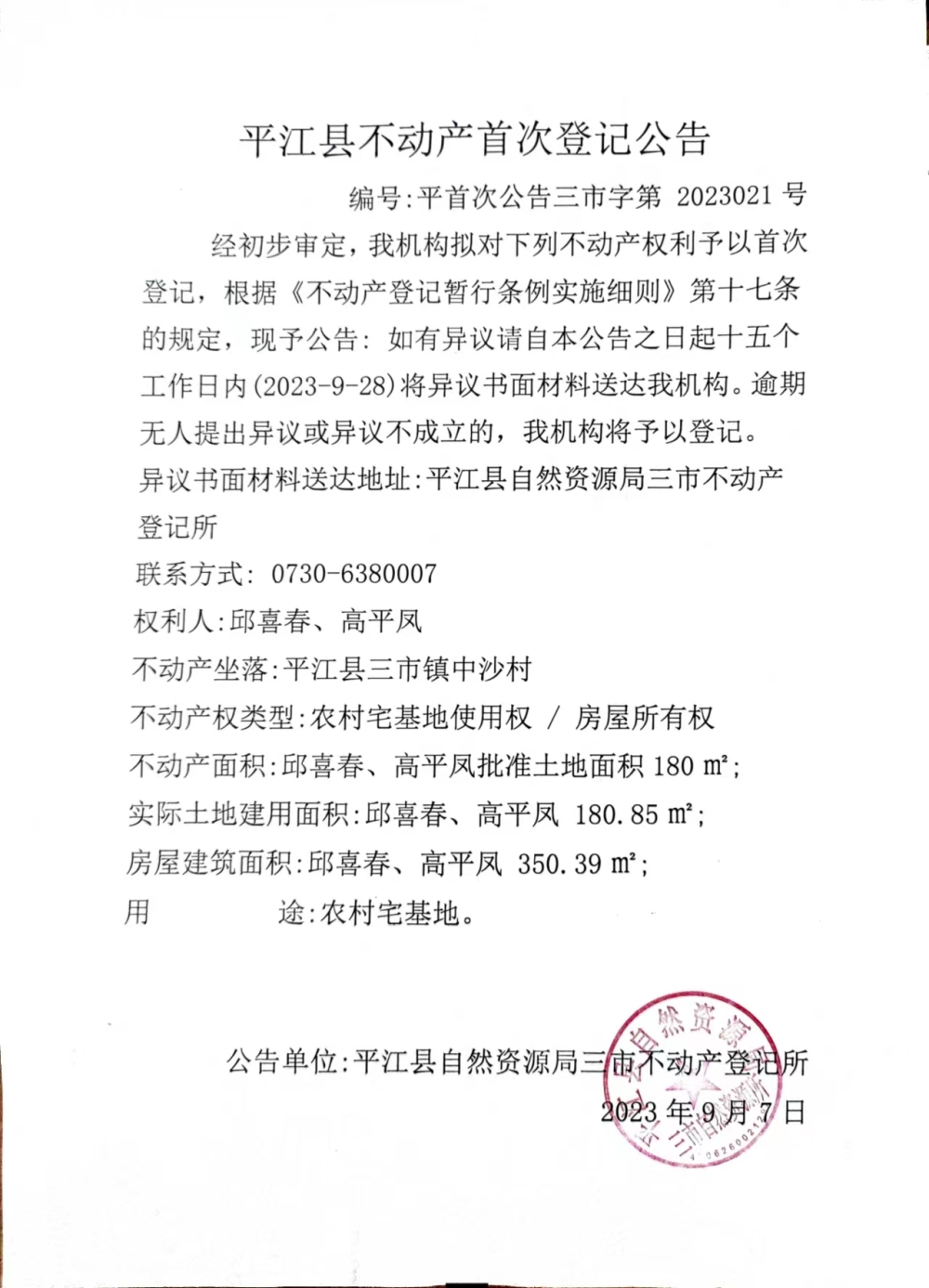 邱喜春 高平凤不动产首次登记公告