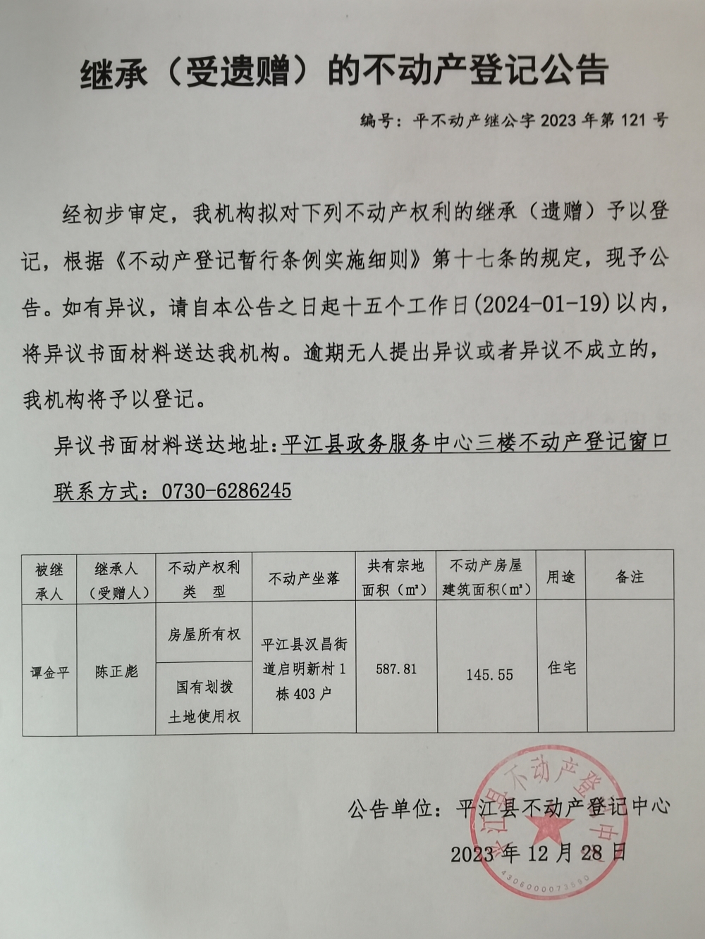 陈正彪继承不动产登记公告