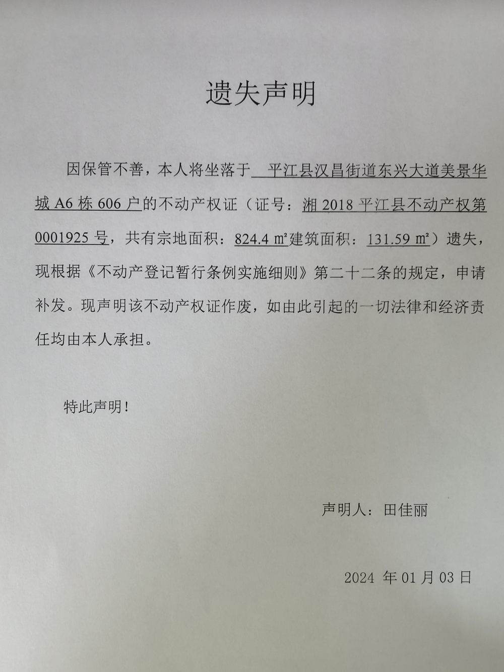 田佳丽(美景华城)不动产权遗失声明