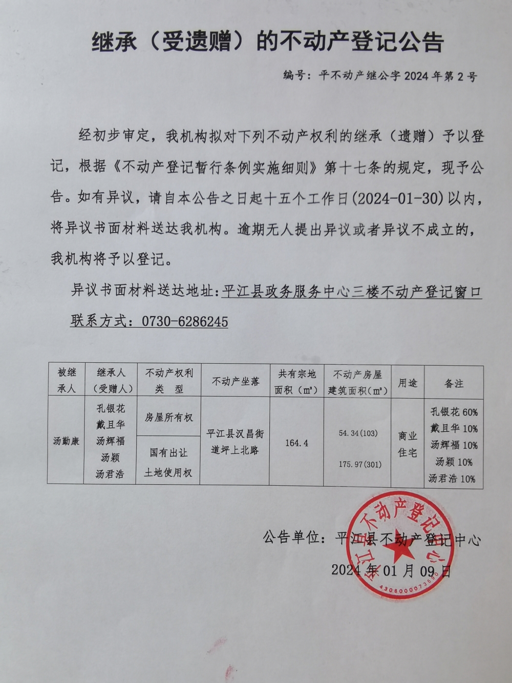 孔银花 戴且华 汤辉福 汤颖 汤君浩继承不动产登记公告