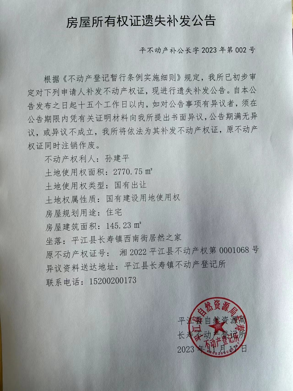 孙建平不动产权证遗失补发公告
