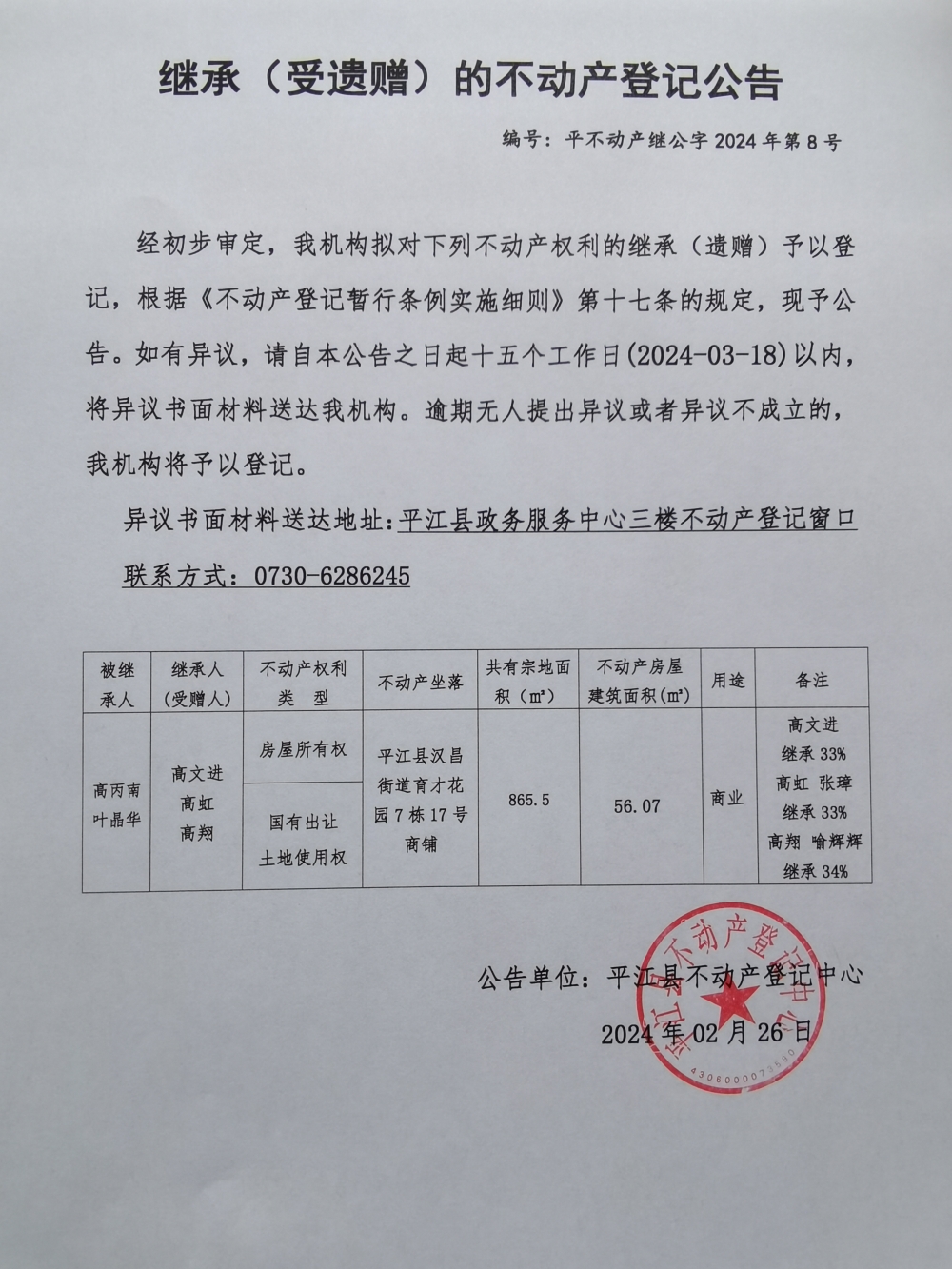 高文进 高虹 高翔继承不动产登记公告(商铺)