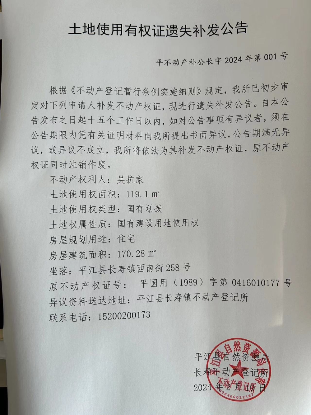 吴抗家不动产登记遗失补发公告