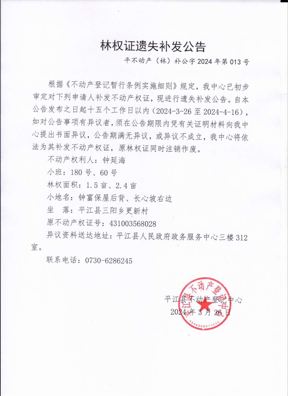 钟延海林权证遗失补发公告