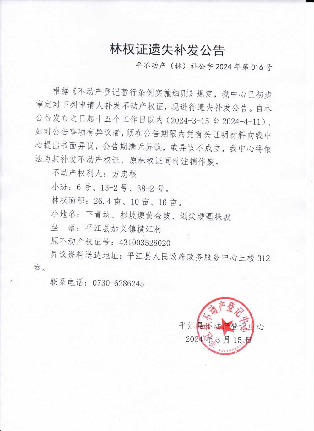 方忠根林权证遗失补发公告