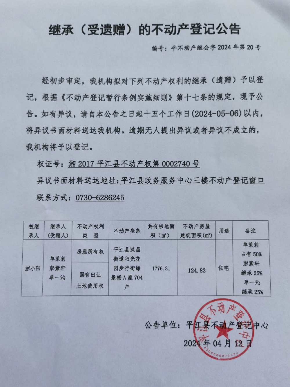 单茉莉 彭紫轩 单一沁继承不动产登记公告
