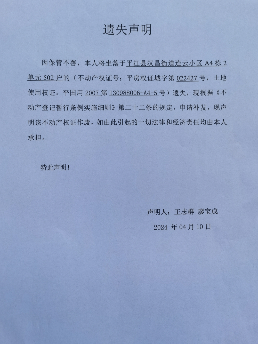 王志群 廖宝成不动产权证遗失声明