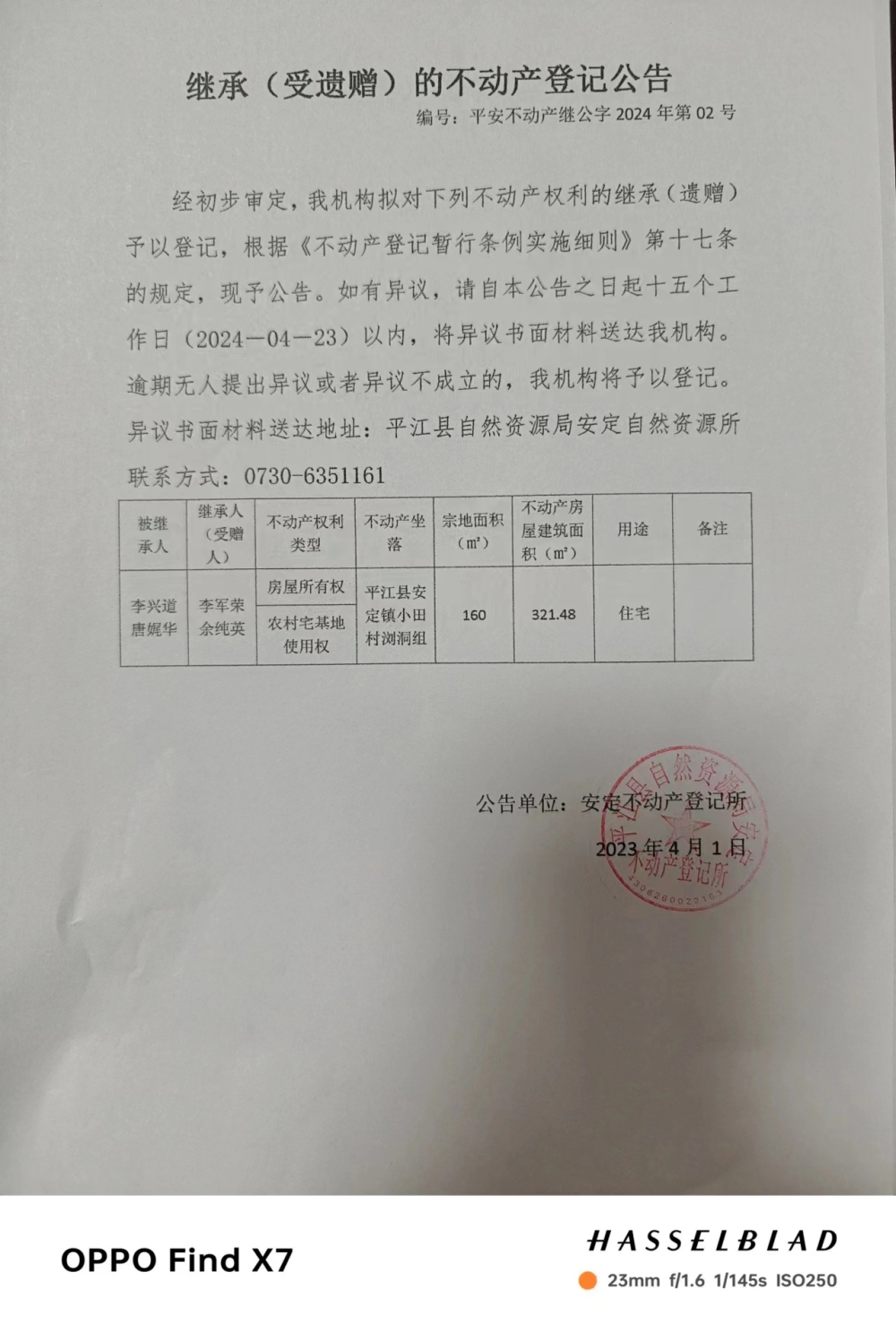 李军荣、余纯英继承(受遗赠)的不动产登记公告