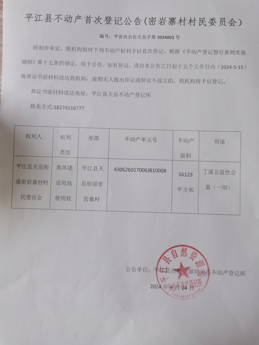 平江县不动产首次登记公告(密岩寨村村民委员会)
