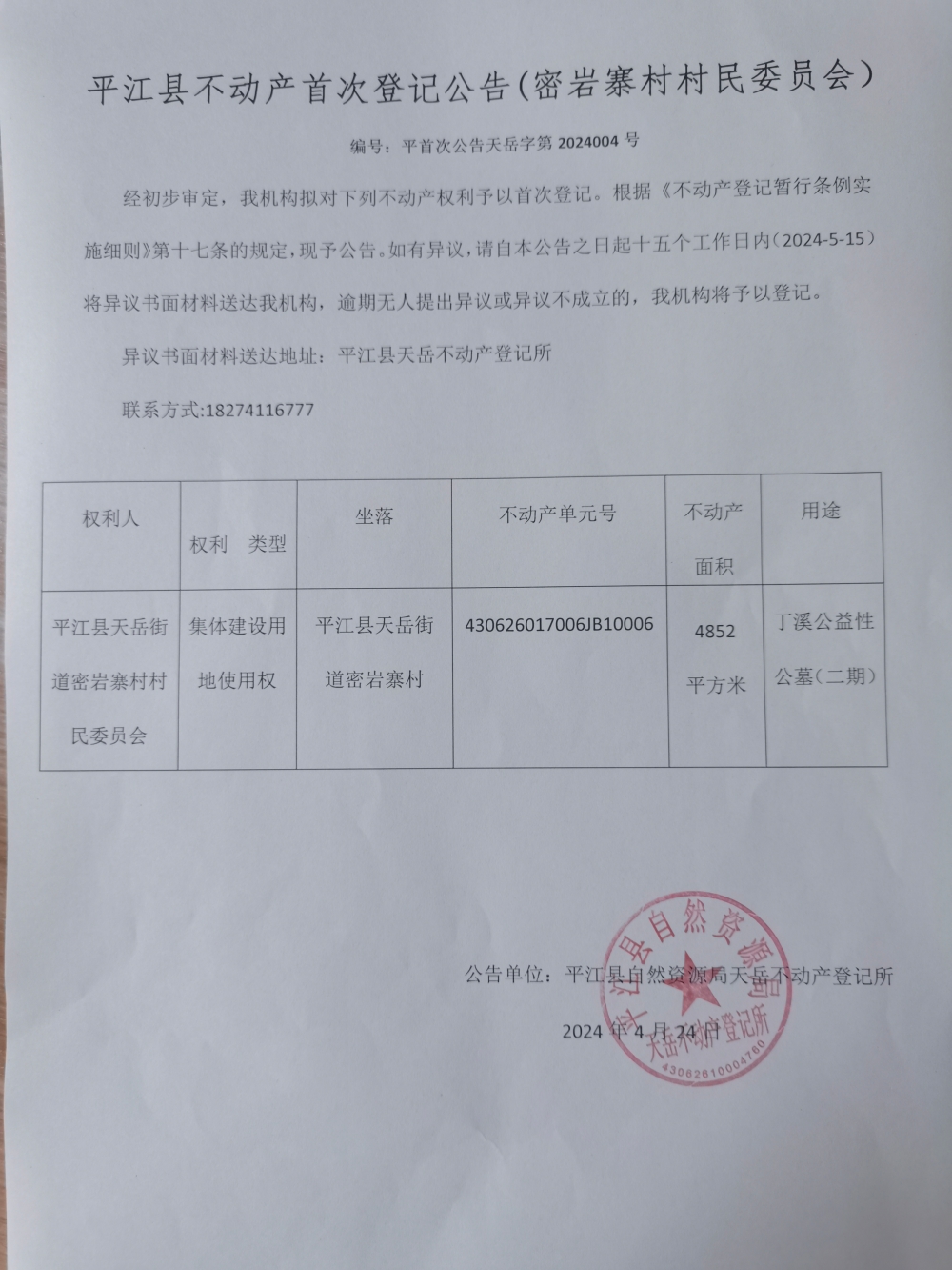 平江县不动产首次登记公告(密岩寨村村民委员会)2
