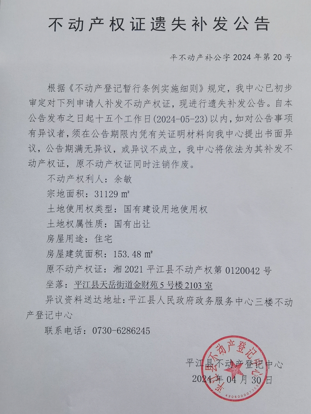 余敏不动产权证遗失补发公告